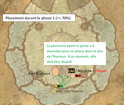 - Le joueur infecté se dirige près d’un add (goule ou, mieux, horreur) dans les 5 secondes, il est dispell, la peste est transmise à l’add => Juste, mais le Roi Liche gagne un buff Siphon de peste.
