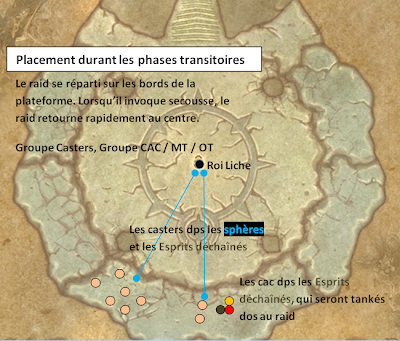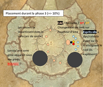Placement : le Roi Liche sera tanké dans un bord de la plateforme. Une fois les Esprits vils présents, il sera déplacé dans l’autre bord de la salle. Les dps cac et les tanks restent en permanence sur le Roi Liche. Les casters se répartissent dans la salle et focus les Esprits vils dès leur apparition. Il est très important qu’ils ne soient pas groupés durant cette partie du combat.