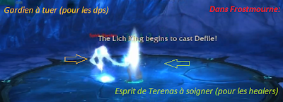 Le Roi Liche va également placer des zones sombres (1 à la fois) sous les joueurs, nommées profanation (Defile). La zone grandit et devient plus puissante aussi longtemps qu’un joueur reste à l’intérieur. Un joueur peu réactif peut faire wipe le raid s’il reste trop longtemps (plus de 2 secondes) sans bouger.