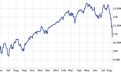 La crise de la dette s’aggravant en Europe fera chuter l’indice de manière brutale, rappelant les pires moments de la crise fin 2008. La dégradation d’un cran de la note de la dette américaine par l’agence S&P le 5 août, après la clôture des marchés, ajoutera de l’huile sur le feu (l’indice perdra près de 2000 points entre le 21 juillet et le 8 août [intraday, plus haut à 12751.43 le 21.07.2011 et plus bas à 10809.85 le 08.08.2011 à la clôture], dont 634.76 points le 8 août).