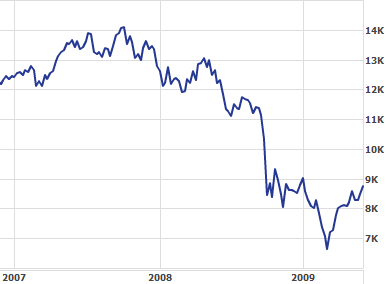 La baisse se poursuivra jusqu’en mars 2009, ou le marché atteindra sont plus bas à 6469 points. A partir de cette date, le marché n’a cessé de monter, franchissant les 7000, 8000, 9000 et 10000 points en 2009. La barre des 11000 sera dépassée en 2010.