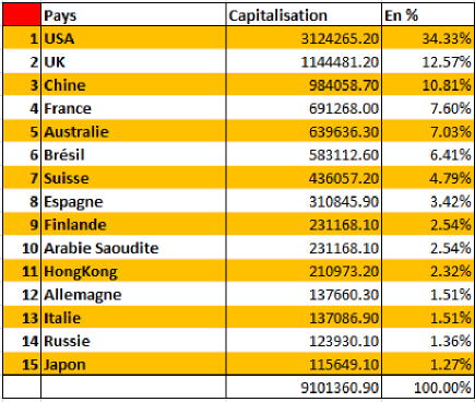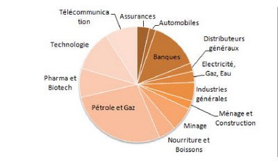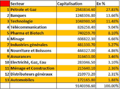Le nouveau classement est basé sur les données de clôture du 31 décembre 2010. Seules les 25 premières capitalisations sont prises en compte. Le classement par secteur d’activité montre que les entreprises actives dans le pétrole et le gaz sont toujours extrêment importantes, tout comme les entreprises financières et celles qui travaillent dans le domaine des nouvelles technologies (Apple a dépassé Microsoft en terme de capitalisation boursière).