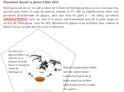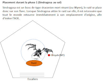 Elle va également cibler une personne, comme nen phase 2, et la transformer en glaçon. Cette personne devra immédiatement sortir du raid et se placer en bas de l’escalier (voir schéma). Tous les dps iront détruire le glaçon en se cachant derrière, afin de gérer la nouvelle capacité de Sindragosa (ci-après).