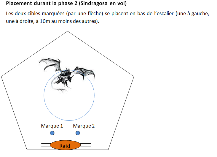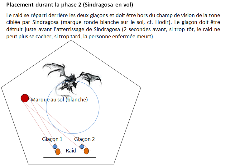 Elle va également cibler une personne, comme nen phase 2, et la transformer en glaçon. Cette personne devra immédiatement sortir du raid et se placer en bas de l’escalier (voir schéma). Tous les dps iront détruire le glaçon en se cachant derrière, afin de gérer la nouvelle capacité de Sindragosa (ci-après).