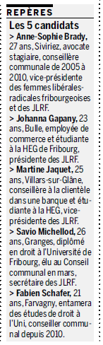 On leur proposait une petite place sur la liste des radicaux pour le Conseil national, comme en 2003 ou en 2007, avec Jean-Luc Pasquier et Claudine Esseiva. Mais ça n’était pas assez, car il y avait trop d’intéressés. Les Jeunes libéraux-radicaux (JLRF) ont donc décidé de lancer pour la première fois leur propre liste en vue des élections fédérales. Ils partent à cinq. A noter qu’il y a là une majorité de femmes. Elles sont trois (Anne-Sophie Brady, Johanna Gapany et Martine Jaquet) pour deux hommes (Savio Michellod et Fabien Schafer).