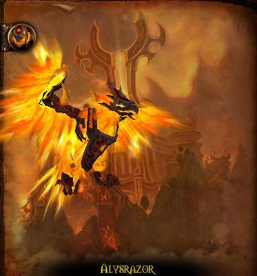 - Molting (Mue): Alysrazor mue, des plumes apparaitront dans près du boss. Ces plumes peuvent être utilisées par les joueurs (les dps), car elles augmentent la vitesse de déplacement et permette de lancer des sorts en déplacement. Si trois plumes sont utilisées par un joueur, il gagne le sort Wings of Flames (Ailes de flamme), ce qui lui permet de voler pendant 20 secondes.