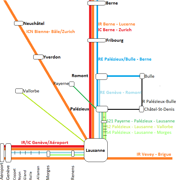 - Le RE pour Lausanne (bleu clair) n’assurera AUCUNE correspondance à Lausanne avec les « Grandes Lignes » (IR/IC en orange ou rouge sur la carte, en direction du Valais, de Genève-Aéroport ou de Bienne). Le temps de parcours en direction de Genève sera augmenté d’environ 19 minutes. Il sera possible d’emprunter la S21 (train actuel du 18) et de changer à Lausanne (prendre l’IC en direction de Genève) afin de ne perdre qu’environ 6 minutes pour se rendre à Genève.