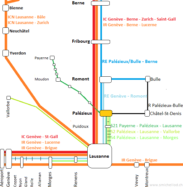 Le schéma ci-dessous présente la situation prévue par l’Horaire Romandie 2013, qui entrera en vigueur au changement d’horaire du mois de décembre 2012, avec les lignes importantes pour les usagers de la gare de Palézieux (la carte n’est donc pas exhaustive):