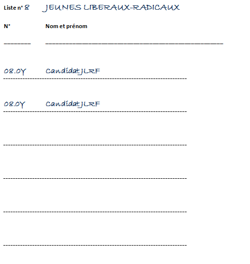Vous pouvez prendre le bulletin vierge et inscrire à la main les noms des candidats que vous désirez. Si vous décidez de ne soutenir qu’un seul candidat de la liste JLRF, inscrivez l’en-tête « Liste 8, Jeunes libéraux-radicaux ». Inscrivez ensuite uniquement le nom de votre candidat favori, au maximum deux fois. Les lignes blanches seront des suffrages complémentaires attribués à la liste 8 :