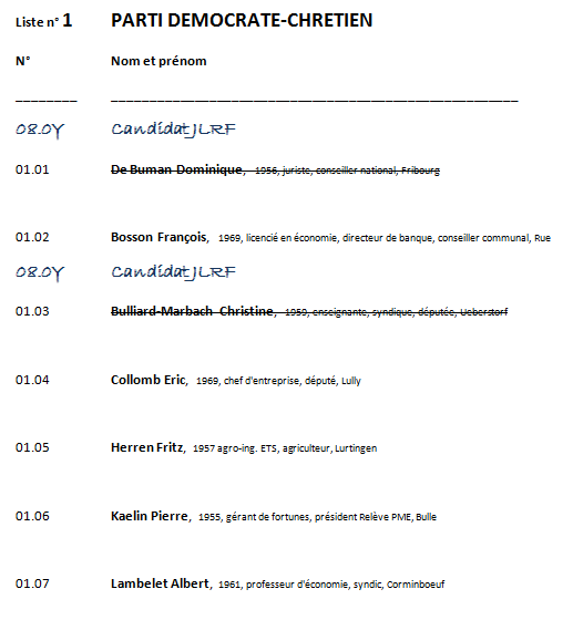 Si la liste 8 (ou une autre) ne vous plait pas telle quelle, ou si vous n’êtes pas libéral radical mais voulez tout de même soutenir un de nos candidats, vous pouvez panacher. Vous devrez dans ce cas biffer le (ou les) candidats qui ne vous plaisent pas (ou moins) et inscrire le nom d’un candidat JLRF, en toute lettre et à la main. Vous avez le droit de cumuler, soit de l’inscrire deux fois, au maximum. Attention, la liste ne doit pas compter plus de 7 noms. Voici un exemple (notez qu’en suivant cet exemple, vous donnez 5 suffrages de parti au PDC, 2 aux JLRF):