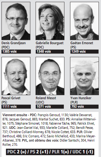 Deux PDC, 2 PS, 1 UDC, 1 PLR: c’est la composition du nouvel équipage de la Veveyse. Les électeurs ont distribué 24100 suffrages de parti (4136 bulletins rentrés) et se sont plus mobilisés qu’en 2006 (+2,4% à 39,2%).