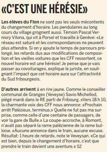 Stupéfaction pour la quarantaine d’élèves du Flon, qui se rendent au Cycle d’Orientation (CO) de la Veveyse. Ils ont découvert le 10 décembre qu’ils ne peuvent plus, comme auparavant, sauter dans le train à Palézieux pour se rendre à Châtel. Leur bus TPF du matin a désormais son terminus à Oron. Ils doivent y embarquer dans un train CFF pour rallier Palézieux, afin d’y attraper un second train, cette fois TPF, à destination du chef-lieu. Un gymkhana dont les élèves, leurs parents et la commune du Flon ignoraient tout jusqu’à l’entrée en vigueur du nouvel horaire des transports publics. Et même jusqu’à hier du côté du CO de la Veveyse.