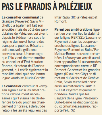 La RGV tire un premier bilan après deux mois et demi d’entrée en vigueur des horaires 2013 (voir ci-contre). Quelques améliorations ont été réalisées sur la ligne Palézieux-Romont. Pour les transports scolaires des élèves du Flon, la Commission transports de la RGV déplore de ne pas avoir pu disposer des horaires du Cycle d’orientation de la Veveyse avant leur entrée en vigueur. «Ce sujet sera un élément majeur traité lors de la consultation des horaires 2014», indique la RGV. A Romont, l’arrêt de la Perrausa a pu conserver une desserte une fois par heure, grâce à une proposition de la Commission des transports. Toujours des soucis en revanche sur la ligne Bossonnens-Attalens-Vevey et Palézieux-Romont via La Joux. La RGV fera part des nombreux retards aux Transports publics fribourgeois (TPF) dans un courrier plus général.Avenir