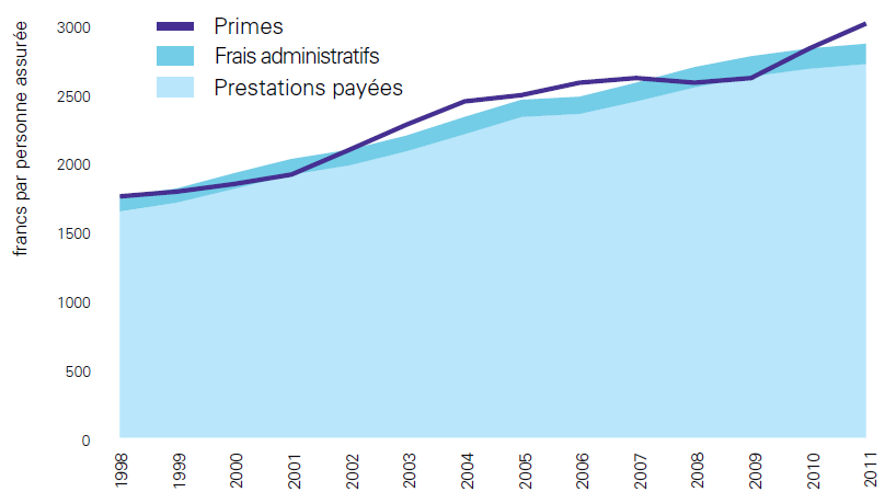 Ainsi, à peu de chose près (constitution des réserves), la hausse des primes est équivalente à la hausse des prestations payées (graphique ci-dessous – OFSP).
