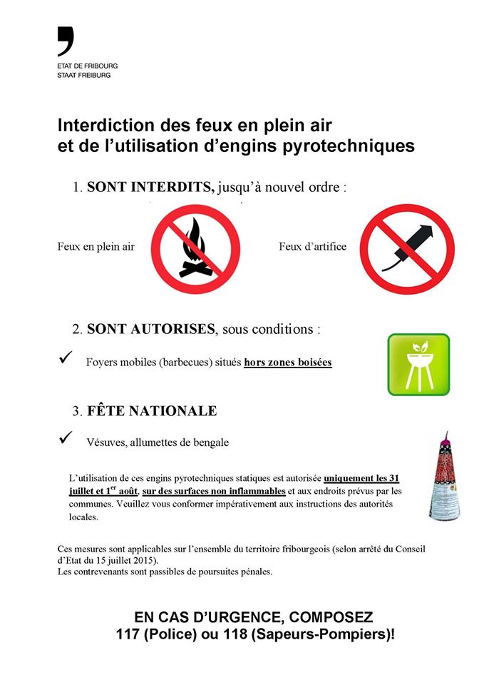 Compte tenu de la situation de sécheresse, des prévisions météorologiques et des risques d’incendie, l’arrêté du Conseil d’Etat, en vigueur depuis le 17 juillet, reste valable jusqu’à nouvel ordre sur tout le territoire cantonal. Les feux en plein air et l’utilisation d’engins pyrotechniques sont donc toujours interdits. Toutefois, des mesures spécifiques sont prévues pour la Fête nationale les 31 juillet et 1er août 2015.