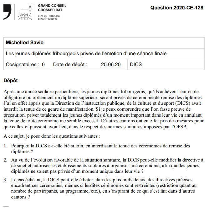 J’ai déposé jeudi dernier une question au gouvernement, afin de savoir pourquoi les jeunes diplômes, particulièrement de l’école obligatoire, étaient privés de cérémonie de remise des diplômes officielle. Voici mon interview à ce sujet sur la RTS. La question déposée se trouve ci-dessous.
