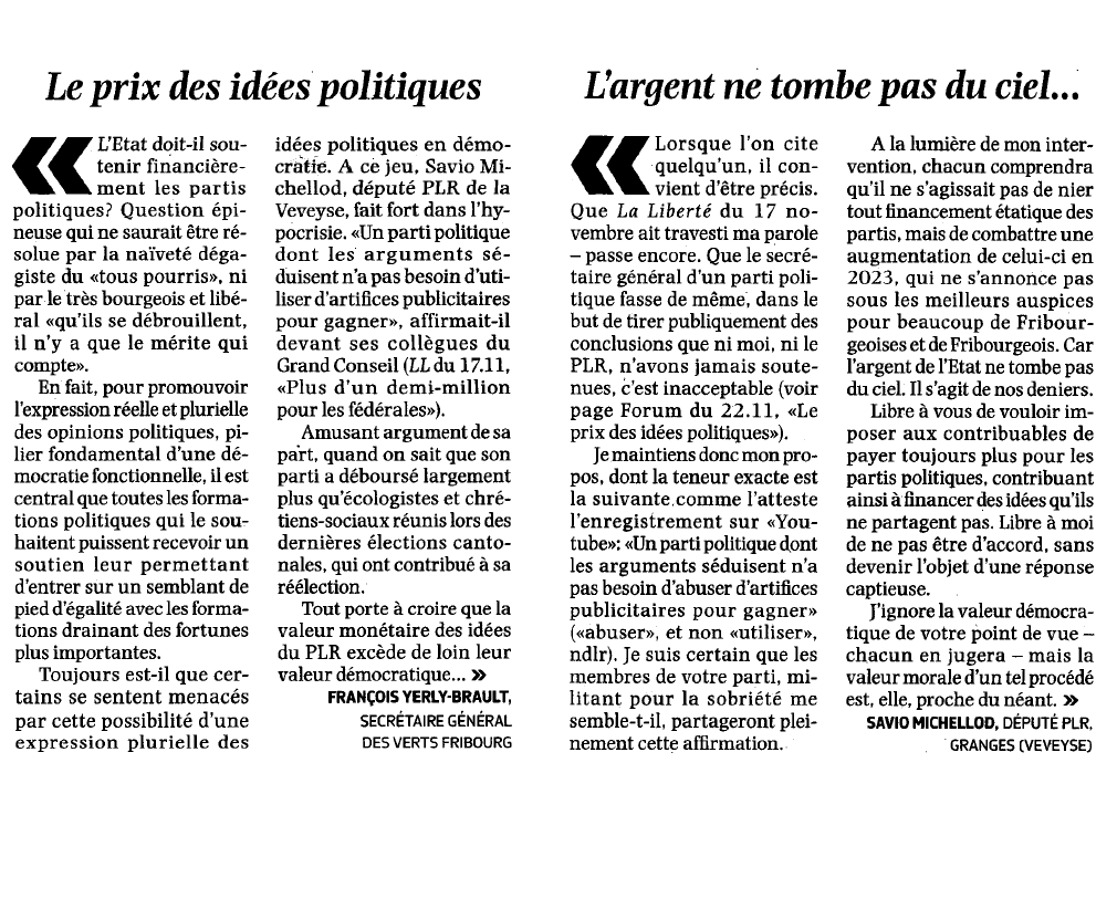 Toujours sur la question du financement des partis politiques, vous pouvez également prendre connaissance de la réaction douteuse du secrétaire général des Vert.e.s dans La Liberté, ainsi que de ma réponse, nécessaire pour remettre les choses au point :
